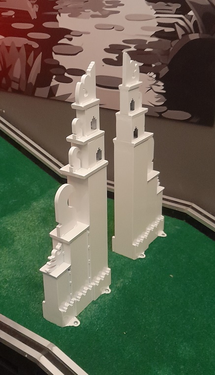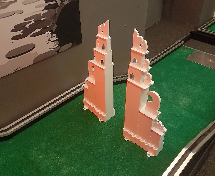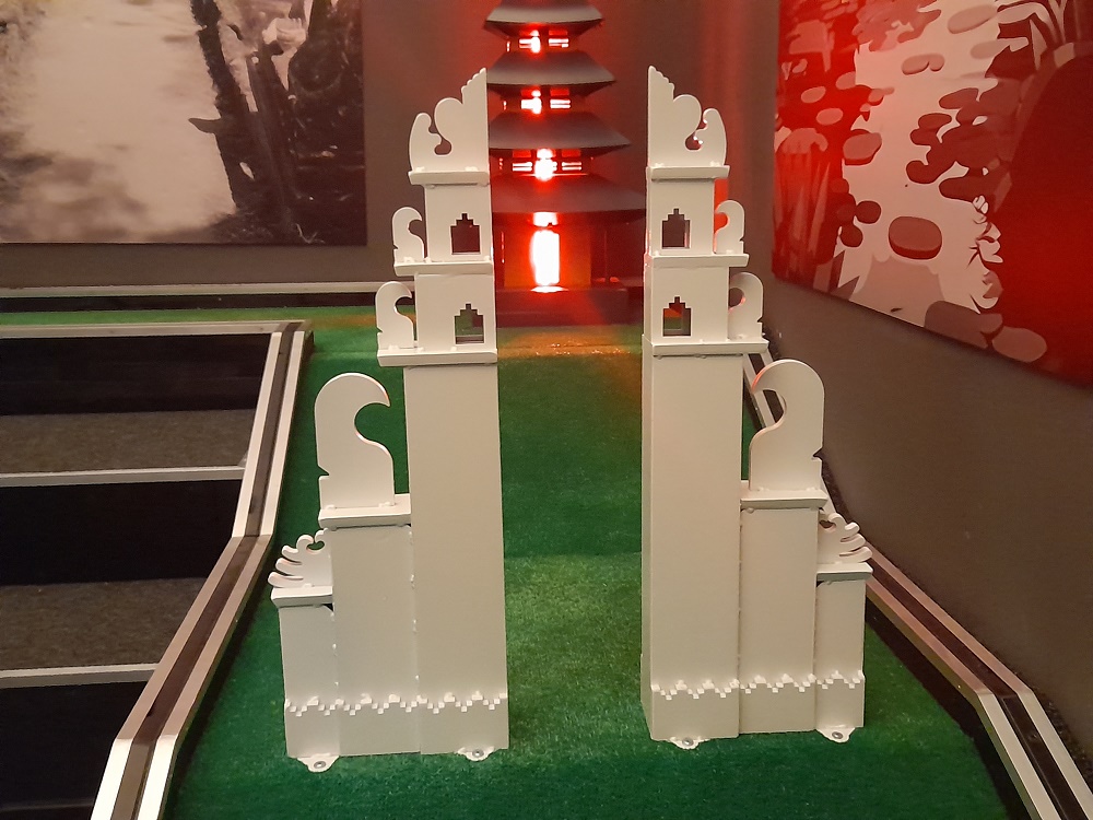 The temple in Bali. Pura Penataran Agung Lempuyang temple split gates is mini golf, miniature golf, crazy golf, adventure golf obstacle made from steel. The ball goes through the area of the split gates. The obstacle is zinc coated and painted for outdoor use or can be just painted for indoor use.